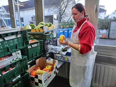 An jedem Vormittag der Woche, von Montag bis Freitag, sammeln wir vorab aussortierte Lebensmittel bei Geschäften und Bäckern der Region ein.