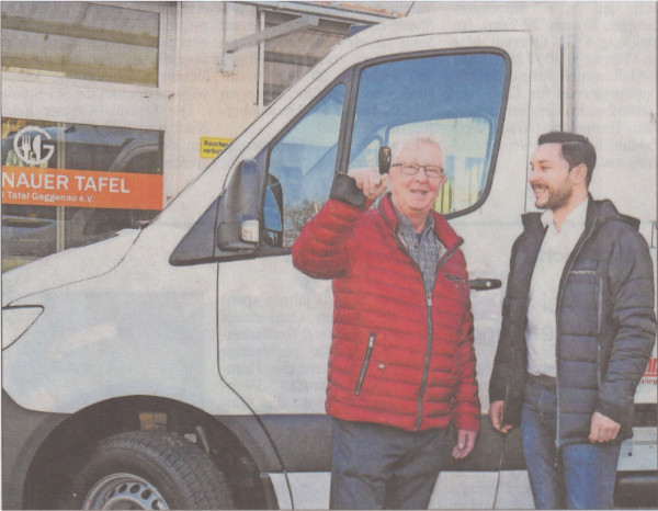 Von einem "coolen Flitzer", der in Betrieb genommen werden kann, sprach der Vorsitzende der Gaggenauer Tafel, Josef Hartmann. An die 44.000 Euro kostete das neue Kühlfahrzeug, das am Dienstag im Rahmen einer kleinen Feierstunde seiner Bestimmung übergeben wurde. Die größte Einzelspende mit 15.000 Euro machte die Volksbankstiftung Baden-Baden Rastatt. Das über weitere Spenden der Sparkasse Baden-Baden Gaggenau, der Daimler AG und Hurrle Spezialtransporte, dem Murgtalbasar sowie der Städte Gaggenau und Gernsbach finanzierte Fahrzeug ist für die Arbeit der sozialen Einrichtung von großer Bedeutung.