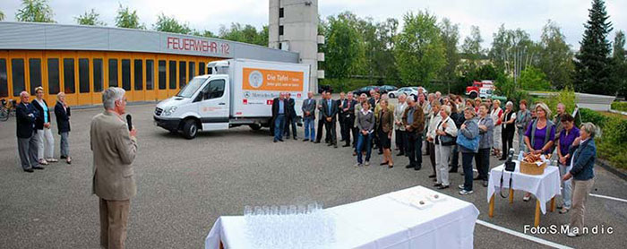 Dr. Helmut Koch, der Mitinitiator und Sprecher des Gaggenauer Tafel Teams (bis April 2010) begrüßte den Schirmherrn der Tafel, Oberbürgermeister Christof Florus, Dr. Holger Steindorf, Werkleiter Mercedes-Benz-Werk Gaggenau, die Sponsoren und Ehrenamtlichen der Gaggenauer Tafel. Joachim Ersing, Daimler AG, Leiter der Niederlassung Baden-Baden übergab den Schlüssel zum Fahrzeug RA-GT-2010 an den damaligen Leiter des Fahrdienstes Josef Hartmann.