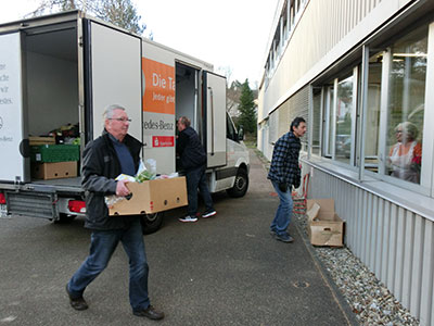 An jedem Vormittag der Woche, von Montag bis Freitag, sammeln wir vorab aussortierte Lebensmittel bei Geschäften und Bäckern der Region ein.