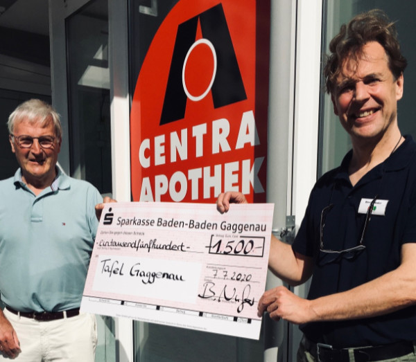 Corona brachte auch für die Apotheken schwierige Zeiten. Wohl kaum jemand war im März auf den Riesenbedarf an Masken und Desinfektionsmitteln, beziehungsweise entsprechenden Alkohol zur Herstellung solcher Produkte zur Desinfektion vorbereitet. Als sie dann endlich zur Verfügung standen, sind die Preise in die Höhe geklettert. Bernd Nufer, Inhaber der Central-Apotheke, "wollte an dem 'Corona-Erlös' nichts verdienen", sagte er der Gaggenauer Tafel. Nufer hatte beschlossen, diesen zu spenden. Josef Hartmann, der Leiter der Tafel, nahm im Namen der Tafelkunden die Spende von 1.500 Euro in Empfang.